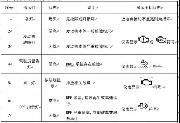 國六發(fā)動機指示燈狀態(tài)說明: