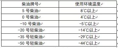 為了使發(fā)動機擁有更高的可靠性和更好的經(jīng)濟型,柴油應(yīng)選用符合19147-2018國六標(biāo)準的正規(guī)柴油,并隨著地區(qū)環(huán)境氣溫的不同而選用不同牌號的清潔柴油。根據(jù)使用環(huán)境氣溫,按下表選用不同牌號的清潔柴油: